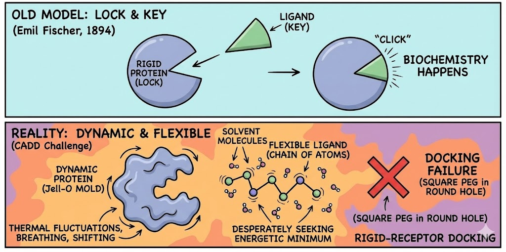 The persistence of this analogy has created a "square peg in a round hole" cognitive dissonance in the field of Computer-Aided Drug Design (CADD). The reality of the microscopic world is not static; it is a chaotic storm of thermal fluctuations. Proteins are not locks; they are more akin to Jell-O molds vibrating in a washing machine. Ligands are not keys; they are flexible chains of atoms desperately seeking an energetic minimum while being bombarded by solvent molecules. When a researcher attempts to perform rigid-receptor docking forcing a static ligand into a static crystal structure they are essentially trying to park a Cadillac in a garage that is currently breathing, shifting, and occasionally collapsing upon itself.