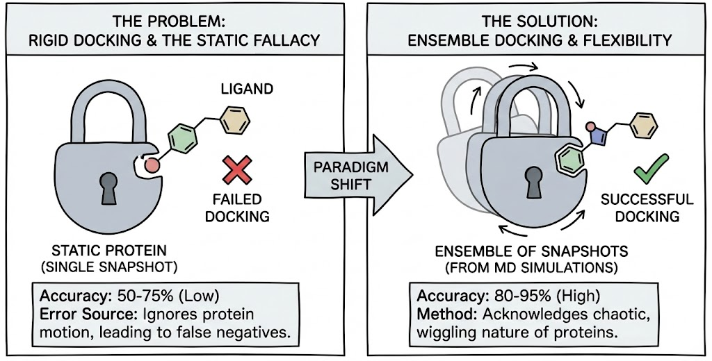 However, the "funny" side of docking failures quickly turns serious when the stakes are human health. The exclusion of protein flexibility is not just a source of frustration; it is the primary source of error in Structure-Based Drug Design (SBDD). Rigid docking efforts typically show performance rates between 50% and 75%, while methods that account for flexibility can enhance pose prediction accuracy to 80–95%.