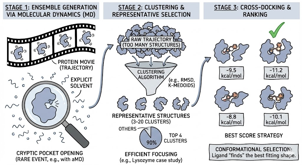 While NMR ensembles or multiple crystal structures can be used, Molecular Dynamics (MD) simulations are the gold standard for exploring the conformational space. MD simulations generate a "trajectory" a high frame rate movie of the protein wiggling in explicit solvent. This captures the crucial role of solvent in stabilizing transient conformations. For rare events, such as the opening of cryptic pockets, techniques like Accelerated MD (aMD) or Metadynamics are used to force the protein to explore high-energy states.