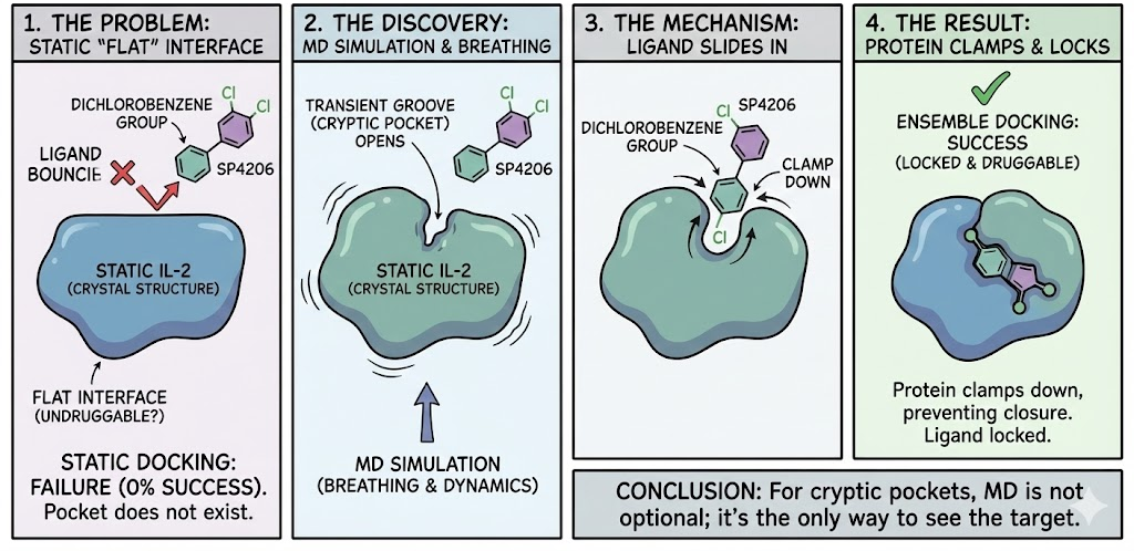 A static docking attempt on the apo IL-2 structure would have failed 100% of the time because the pocket simply did not exist in the input coordinates. This demonstrates that for cryptic pockets, ensemble docking is the only viable approach.