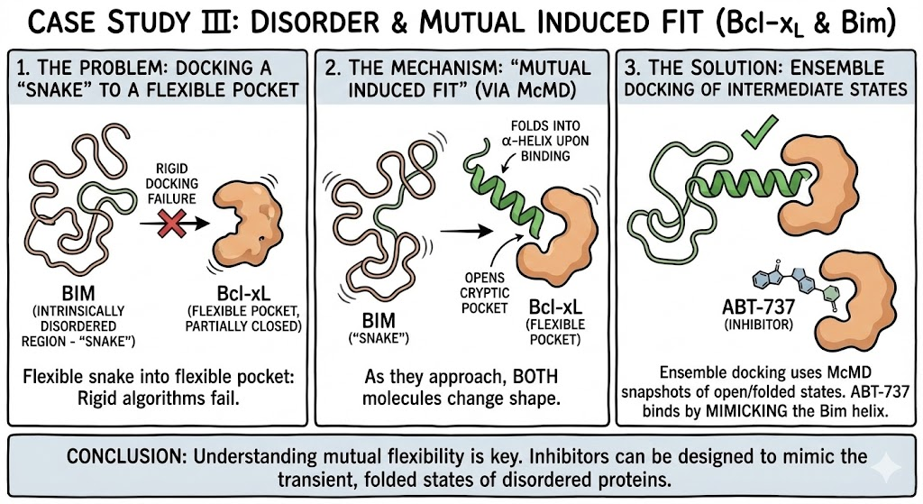 Bcl-xL, a cancer drug target, binds to the Bim protein, which contains an Intrinsically Disordered Region (IDR). Docking a flexible snake (Bim) into a flexible pocket (Bcl-xL) is the ultimate nightmare for rigid algorithms.