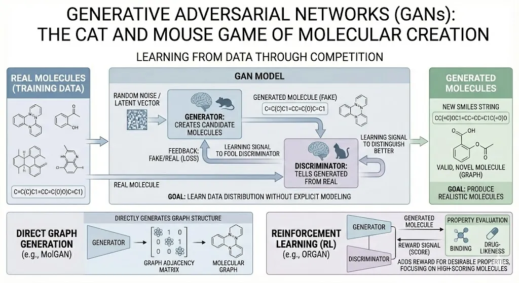 Think of a GAN as two neural networks playing a game of cat and mouse. One network (the generator) creates candidate molecules, while the other (the discriminator) tries to tell generated molecules apart from real ones it saw in training. Over many rounds, the generator learns to produce molecules that look real enough to fool the discriminator. In effect, GANs learn the distribution of the training data without explicitly modeling it. For molecules, this can mean generating new SMILES or even molecular graphs. Some models (like MolGAN) directly generate graph adjacency matrices of small molecules. Others incorporate reinforcement learning: they add a reward signal for desirable properties. For instance, the ORGAN model is a GAN-like framework where molecules scoring well (e.g. good binding or drug-likeness) give higher reward. This reward is incorporated into the training so that the generator gradually focuses on producing high-scoring molecules(Abeer et al., 2024). In short, GANs are another way to learn to write new SMILES strings (or build graphs) by competing against a critic.