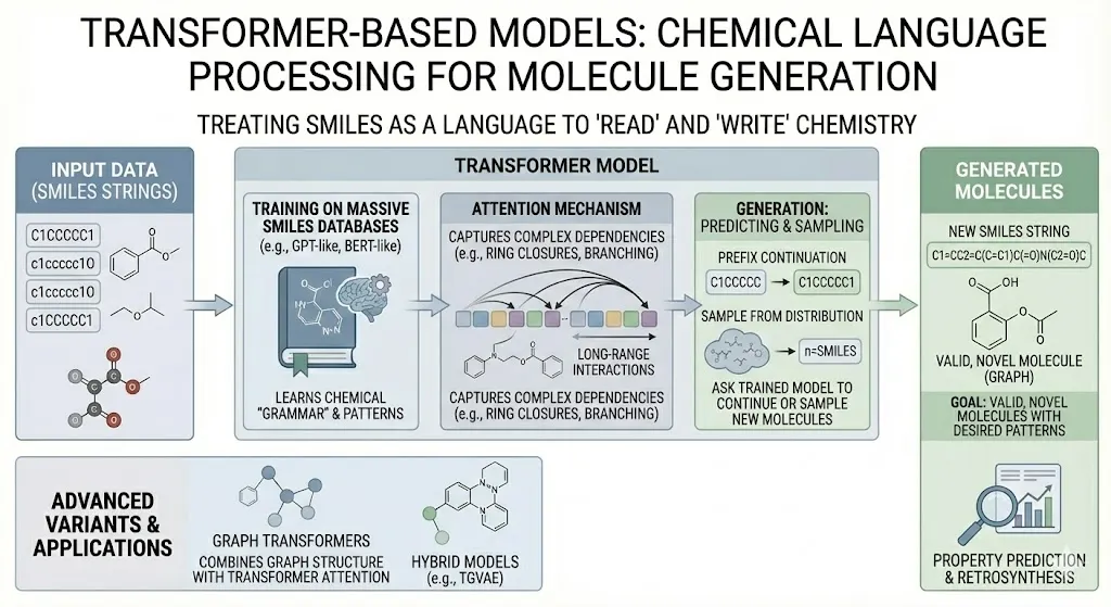 The recent NLP revolution with Transformers has spilled into chemistry. Here, SMILES strings are treated literally as a chemical language. A Transformer model (like a molecule-version of GPT or BERT) is trained on massive databases of SMILES. By learning the “grammar” of chemistry, it can then predict missing parts of a string or generate entire new strings. Since Transformers attend to all parts of the sequence, they can capture complex dependencies (like ring closures, branching) in SMILES. One can simply ask a trained “SMILES-GPT” to continue a prefix or sample new molecules from its learned distribution. Researchers have indeed built “chemical language models” that generate valid, novel SMILES with desired patterns (Bran & Schwaller, 2023). The power of this approach is that any improvement in language modeling (like the GPT-4 scale models) could translate into better molecule generation. Transformers have already been used for retrosynthesis, property prediction, and now generation all by exploiting analogies between chemical and natural language. In short, these models read and write chemistry in the language of SMILES. (Advanced variants even treat molecules as graphs with attention mechanisms or use hybrid graph-transformer models like the TGVAE, but at core it’s “make SMILES with language AI.”)