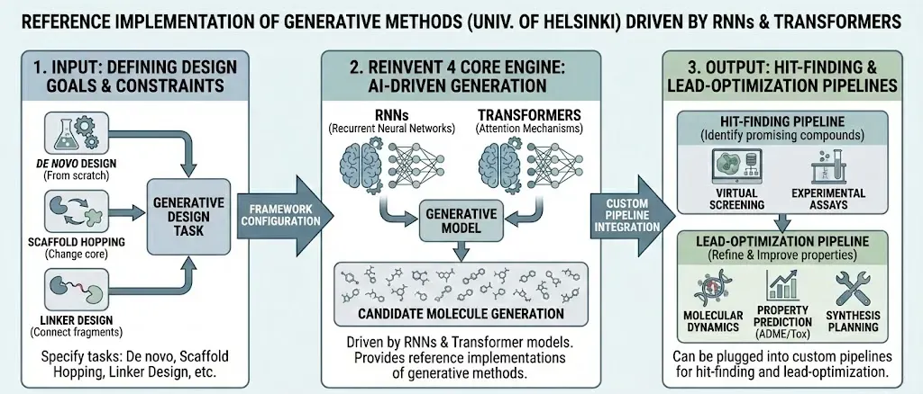 Notably, many real world tools use combinations of these methods. For example, the open-source REINVENT 4 framework uses recurrent neural networks and Transformers to drive molecular generation, wrapped in reinforcement learning loops (Loeffler et al., 2024). It can propose R-group substitutions, design libraries, or hop scaffolds, all through generative AI