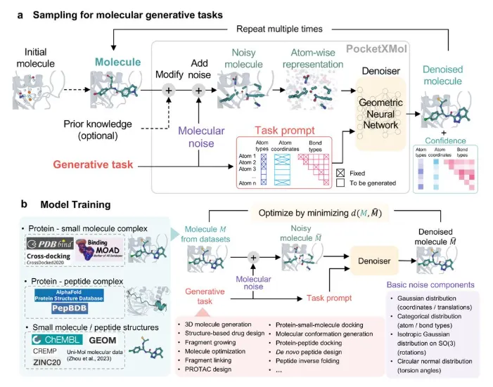 PocketXMol builds on the idea of pocket-conditioned generation using a more advanced 3D denoising diffusion probabilistic model (DDPM). Where Pocket2Mol uses a two-stage system, PocketXMol operates in a fully unified framework: