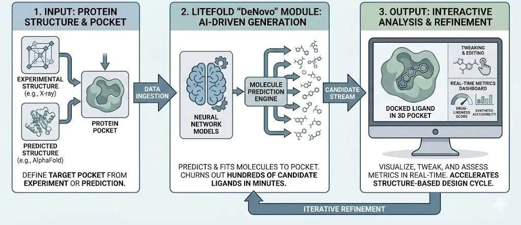 These ideas aren’t just academic. Several tools and platforms are bringing generative design into the hands of chemists and biologists. LiteFold’s “DeNovo” module lets users specify a protein pocket (from experiment or a predicted structure) and then churns out hundreds of candidate ligands in minutes. Under the hood, LiteFold uses diffusion based neural network models to predict molecules that fit the pocket. Users can then visualize each new molecule docked in 3D, tweak them, and see metrics like drug-likeness or synthetic accessibility in real time. In short, LiteFold automates and accelerates the structure-based design cycle.