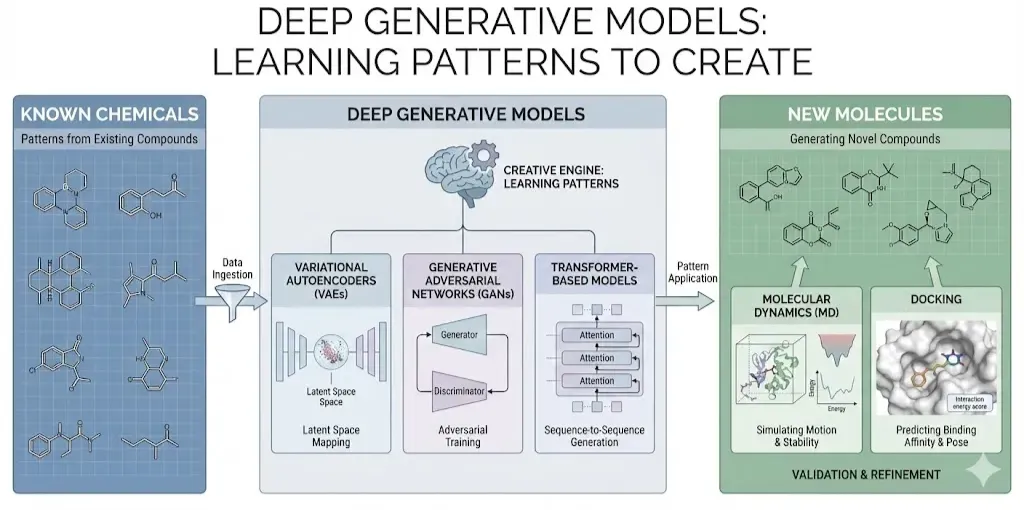 How do these AI wizards actually conjure new molecules? At the heart of virtual generation are deep generative models. Three popular classes are Variational Autoencoders (VAEs), Generative Adversarial Networks (GANs), and Transformer based models. Each has a different “creative engine,” but all share the goal of learning patterns from known chemicals and using them to make new ones.