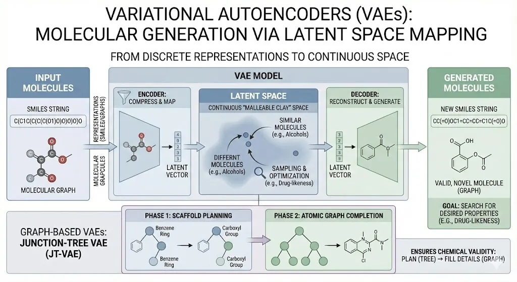 A VAE learns to compress and then reconstruct molecules. In practice, a molecule is often represented as a SMILES string (a text notation of its structure) or as a graph of atoms and bonds. The VAE has two parts: an encoder that turns the input (SMILES or graph) into a point in a continuous “latent” space, and a decoder that tries to map back from that latent vector to a valid molecule. By training on a dataset of existing compounds, the VAE learns a smooth map: similar molecules end up near each other in latent space. Once trained, we can sample or optimize points in this latent space and decode them to generate new SMILES strings. This lets us search for molecules with desired features. For example, Gomez-Bombarelli et al. used a VAE to map discrete SMILES into a low-dimensional continuous space, enabling efficient optimization for properties like drug likeness. In other words, VAEs let us treat molecules somewhat like malleable clay in a continuous space, rather than as isolated strings.