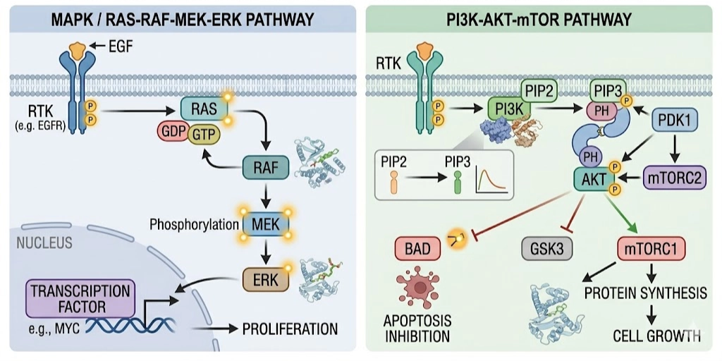 The rise of precision oncology has been driven by the understanding that specific genetic mutations can directly control cancer growth and survival. Targeted cancer therapy has greatly improved outcomes in non-small cell lung cancer (NSCLC), especially through inhibition of the Epidermal Growth Factor Receptor (EGFR). Activating mutations in EGFR, such as exon 19 deletions and L858R, lead to continuous signaling through growth pathways like RAS–RAF–MEK–ERK and PI3K–AKT, resulting in uncontrolled cell proliferation. However, in many lung adenocarcinomas, activating mutations in the EGFR kinase domain disrupt this regulation. The most common mutations, including exon 19 deletions and the L858R substitution, lock the receptor in a constitutively active state. As a result, cells receive continuous growth signals independent of external stimuli, leading to uncontrolled proliferation and tumor progression.
