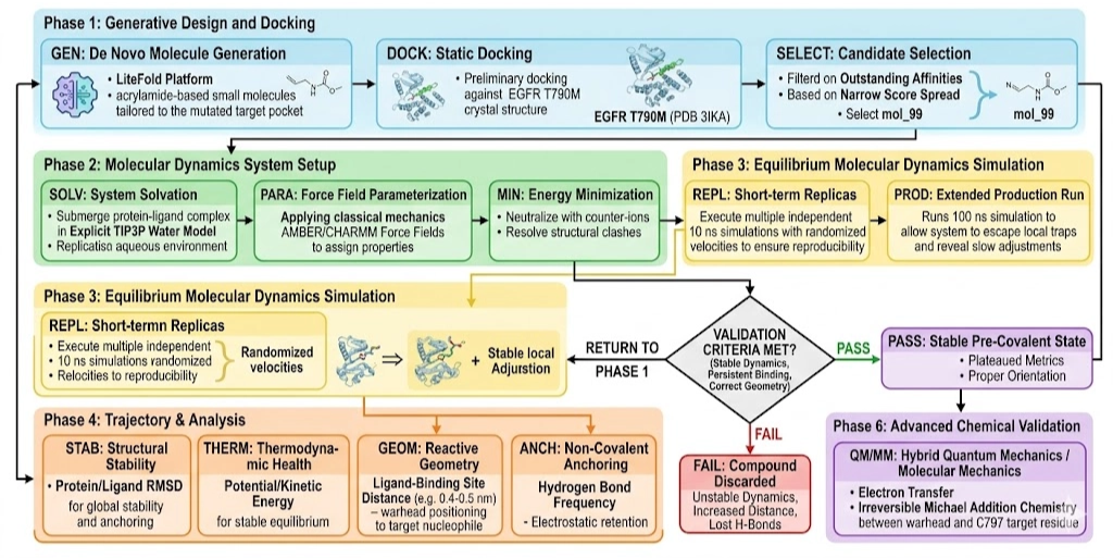 This study describes a structure-guided, AI-assisted workflow for de novo design and dynamic validation of a new covalent inhibitor candidate specifically tailored to the EGFR T790M binding pocket, using the LiteFold computational platform.