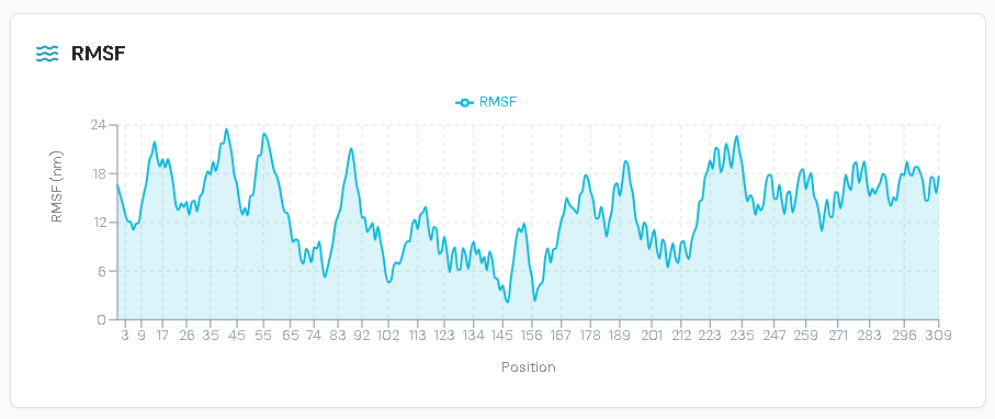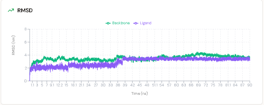 The protein backbone RMSD stabilised and plateaued at approximately 3.0–4.0 Å (0.3–0.4 nm) within the first tens of nanoseconds. This magnitude of fluctuation is expected and physically meaningful for a multidomain kinase: proteins are not rigid crystals, and the conformational breathing required for function is captured here as it would be in a real biological setting. The plateau rather than continued drift confirms that the simulated EGFR T790M structure maintained overall structural integrity throughout the run.