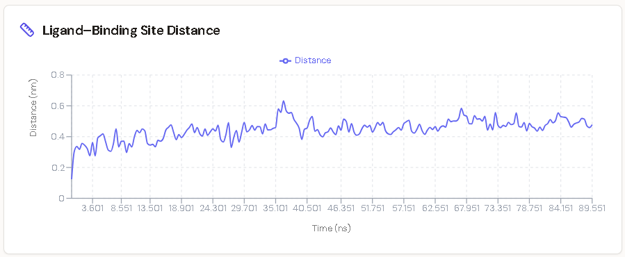 The distance between the molecule and the core binding site fluctuated within a constrained range of 0.4–0.5 nm (4–5 Å) throughout the full trajectory. Successful Michael addition requires the acrylamide β-carbon to approach within approximately 3.6–4.0 Å of the Cys797 sulfur. The MD data confirm that the ligand does not drift away from the reactive zone at any point during the simulation.