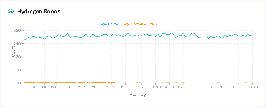 The ligand maintained an uninterrupted network of three hydrogen bonds with the surrounding pocket residues across the entire 100 ns run. While the broader protein structure naturally flexed sustaining approximately 280–300 internal hydrogen bonds with normal fluctuation the three ligand-specific anchor contacts never broke. This persistent electrostatic tethering provides the geometric constraint necessary for the acrylamide warhead to remain properly oriented relative to Cys797.