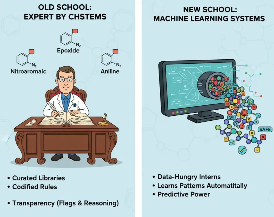 Before AI hype, software relied on wisdom from chemists into codified ruled based systems. These tools run on curated libraries of structural alerts (a.k.a. toxicophores): chemical substructures repeatedly associated with toxic outcomes.